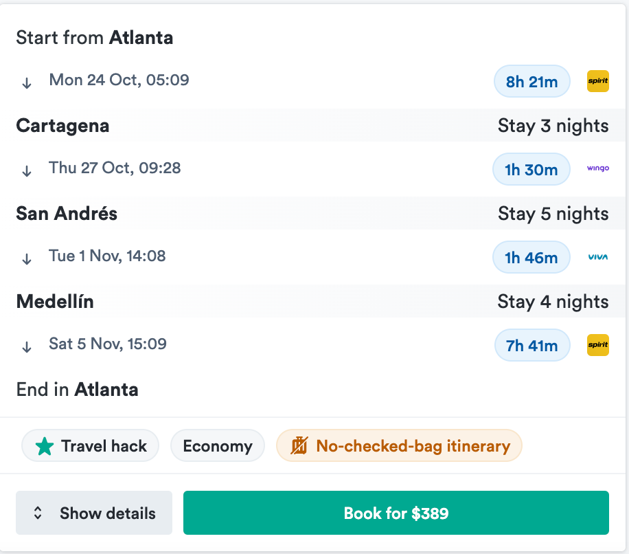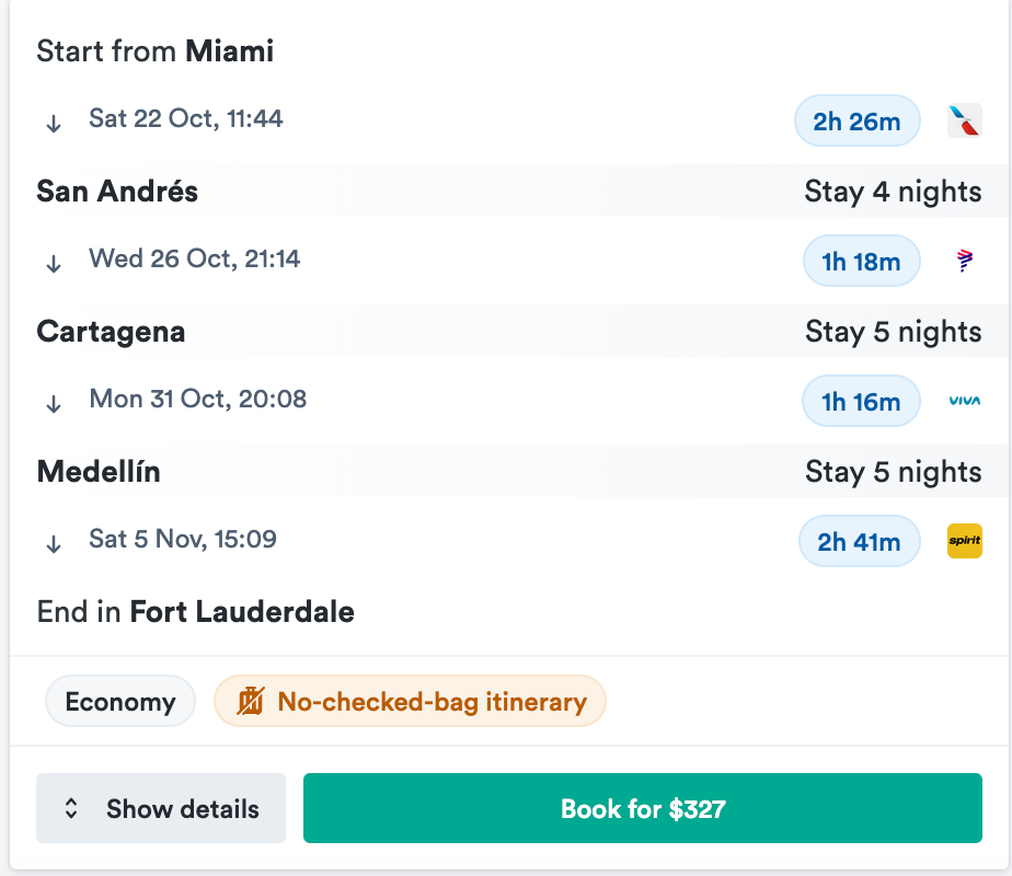 You can book this multi-city flight to Colombia with just one click from a very reputable travel website Kiwi.com
